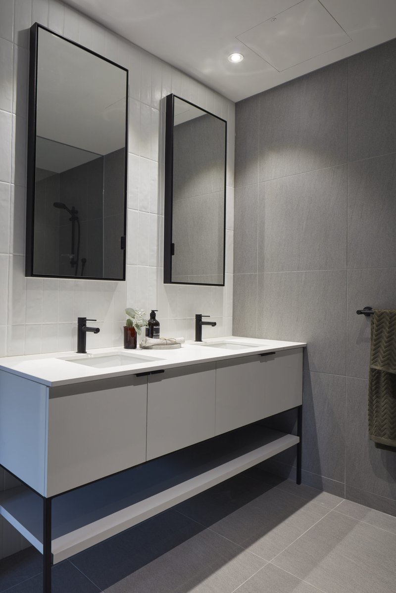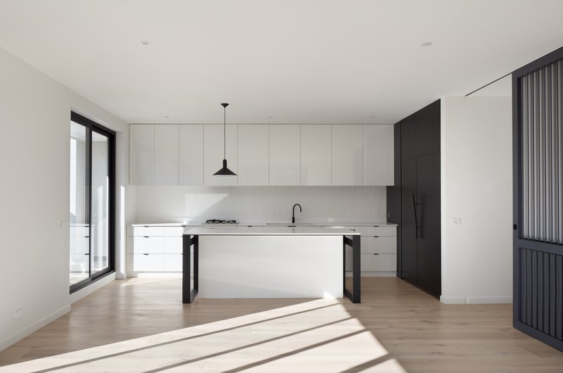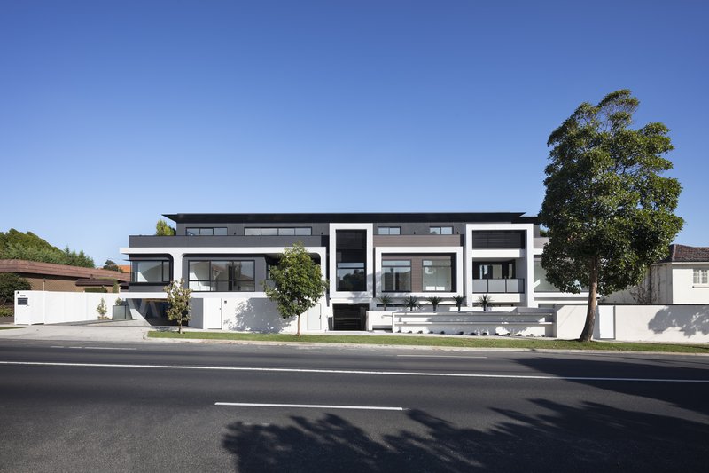En Vue é uma seleção exclusiva de vinte e dois apartamentos de luxo, com opções de um, dois e três quartos, situada no coração de Bayside, Sandringham. Este empreendimento é um verdadeiro marco de interiores belíssimos e detalhes requintados, com cada residência exibindo de forma impressionante a mais recente elegância contemporânea, em harmonia com acabamentos e fittings de alto padrão. En Vue combina um caráter único e uma estética moderna, resultando em um edifício que se destaca na suburbana Bayside. Todos os apartamentos foram projetados para garantir uma disposição em plano aberto, integrando cozinha, sala e área de jantar, sem comprometer os espaços privados individuais. Cada apartamento proporciona um ambiente contemporâneo e suavizado, ideal para refletir e relaxar. A concepção de En Vue foi guiada por duas prioridades fundamentais: individualidade e luxo. Cada unidade conta com uma abundância de luz natural, preservando ao mesmo tempo uma sensação duradoura de privacidade e solitude. En Vue respeita as propriedades vizinhas ao se posicionar de forma discreta na paisagem urbana, reduzindo o impacto visual geral dos edifícios e impondo menos sobre o ambiente local. Essa abordagem também permitiu que os apartamentos no nível do solo dispusessem de áreas externas generosas, varandas no primeiro andar e terraços privados no segundo andar. A proximidade com a praia de Sandringham foi cuidadosamente considerada, visando maximizar as vistas deslumbrantes, que são um lembrete constante da proximidade da baía. A fachada moderna do empreendimento foi projetada como uma unidade coesa, em vez de segmentar e destacar cada apartamento individualmente. Isso acrescenta ao charme de En Vue, pois sua fachada integrada promove um estilo de vida mais interconectado com a comunidade mais ampla de Sandringham. Uma paleta de cores clara, composta por revestimento em madeira e concreto branco, contribui para a unificação da elevação da rua, ao mesmo tempo que enriquece a vitalidade da área. A dificuldade em distinguir facilmente entre os apartamentos na fachada diminui o impacto visual na rua, ao combinar com a paleta de cores claras, predominantemente composta por concreto branco e revestimento em madeira.